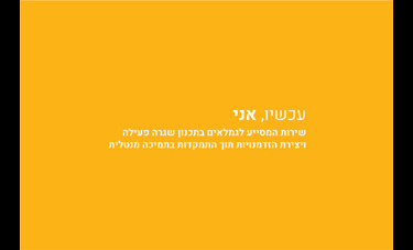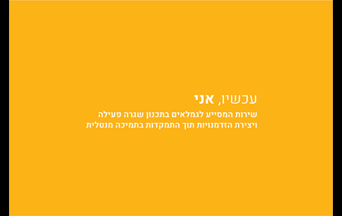 הסלוגן שבחרנו ללווי הפרויקט הוא "עכשיו, אני", כיוון שאחת התובנות הראשונות שלנו היא שבתקופת חיים זו, האדם יכול לשים את עצמו במרכז ויש לו הזדמנות ליצור משמעות אישית חדשה.