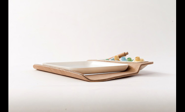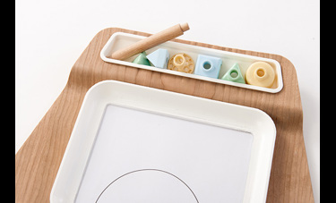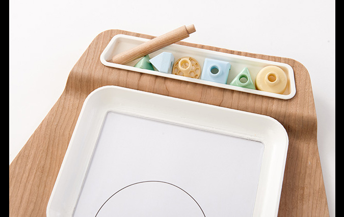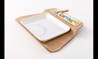 2. הילד שם את הציור מתחת לצלחת במקום המיועד, כאשר הצלחת שקופה בתחתית וניתן לראות את הציור דרכה.