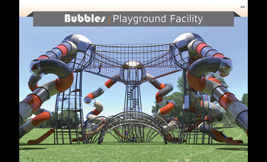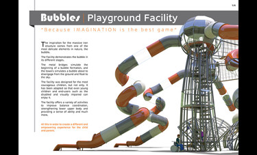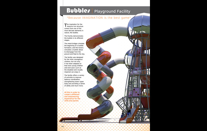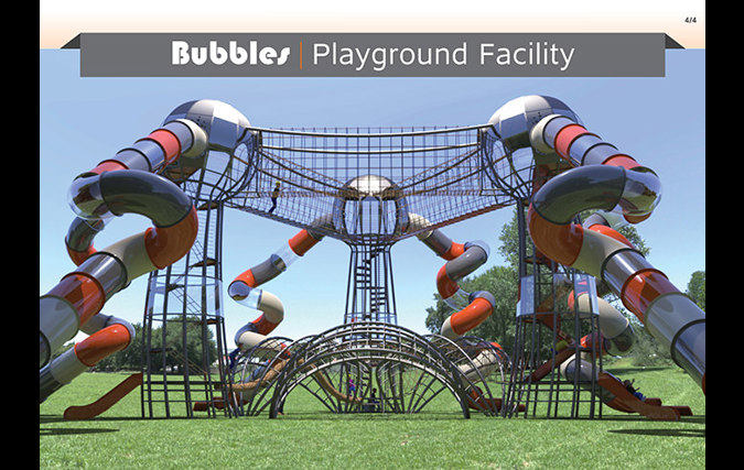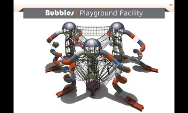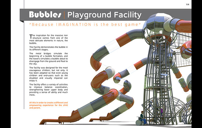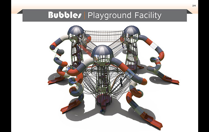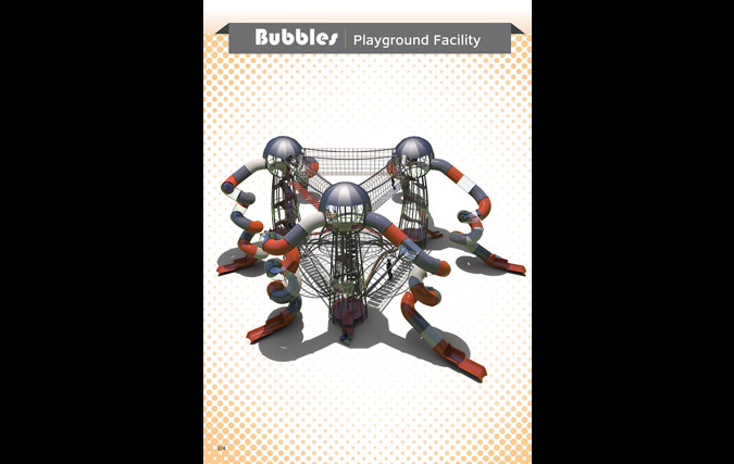 המתקן הענק "בועות" עשוי ממבנה מפלדה מסיבית, אך ההשראה לצורה ולמבנה שלו מגיעה מאחד האלמנטים העדינים בטבע - הבועה. המתקן מדגים בועות בשלבים שונים. גשרי הברזל על הקרקע ממחישים את שלב היווצרות הבועות והמגדלים ממחישים בועות העומדות להתנתק מהקרקע ולעוף לשמים. המשחק במתקן מסייע לפתח את שרירי הגוף, משפר קואורדינציה, מחזק את תחושת המסוגלות והביטחון העצמי ונותן כלים להתמצאות במרחב ולתכנון לטווח רחוק, כל זה על מנת ליצור תחושה שונה ומעצימה לילד ולמלווה.