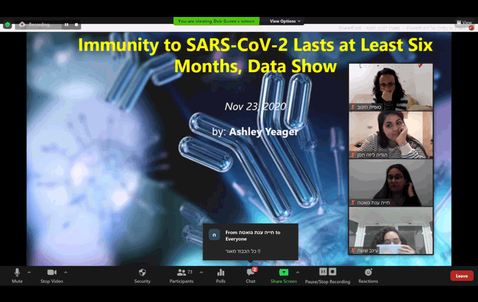 סטודנטים משנה ג׳ - רוני בטנר, דביר גורן ומאור לוי הציגו מחקרים שונים על וירוס הקרונה. ראשת החוג, ד"ר איילת ארבל, הציגה פיתוח טכנולוגית קריספר (CRISPR) – שיטה לעריכת גנים, שמובילה למהפכה בתחומי התראפיה הגנטית והמחקר המדעי. ד"ר לאה בראז הציגה את גילוי של הוירוס צהבת C, הגורם לצהבת נגיפית מועבר במנות דם ובו נדבקים כשני מיליון בני אדם בעולם מדי שנה. אם לא מאובחן ומטופל – מביא נזק חמור לכבד ואף למוות. תרומת החוקרים היתה בגילוי, איבחון ופיתוח טיפול לנגיף.
