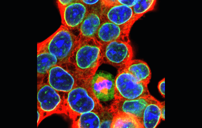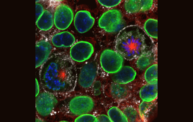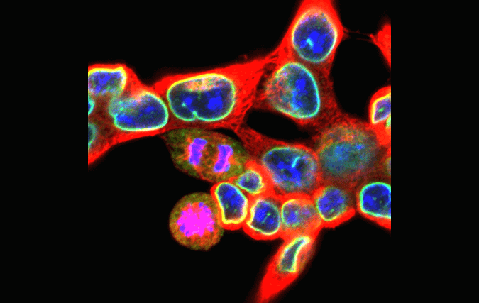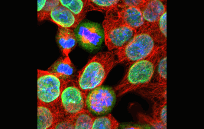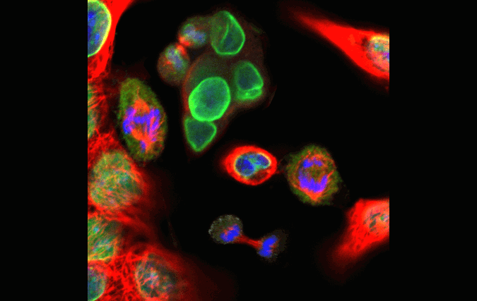 בתמונות מן הניסוי אפשר לראות שלבים שונים של מחזור התא, כאשר כל מרכיב צבוע בצבע אחר.